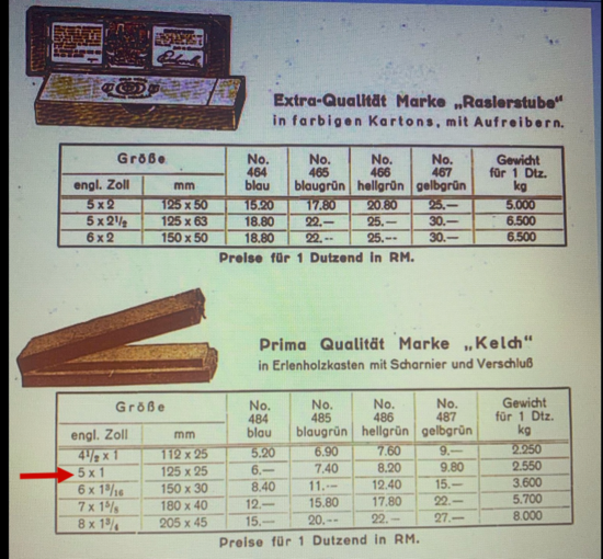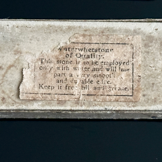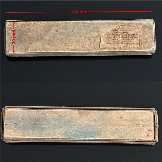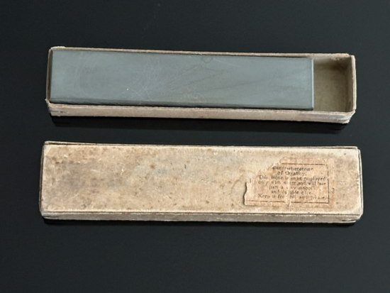 Die Schachtel ist aus grau-gelber Pappe und weist auf der Unterseite in Teilen einen grünlichen Stich auf. Hier gehe ich aber von Abrieb von einer anderen Schachtel aus, auf der diese Schachtel evtl. gelagert wurde. Interessanter ist da schon der Rest des ehem. Aufklebers, der mit Sicherheit zur Rätsels Lösung beitragen kann. Die Sprache ist Englisch und beinhaltet bzw. thematisiert die Qualität und Leistung beim Rasiermesser und am Ende ist ein Hinweis zu lesen, dass Öl vom Stein fernzuhalten ist.