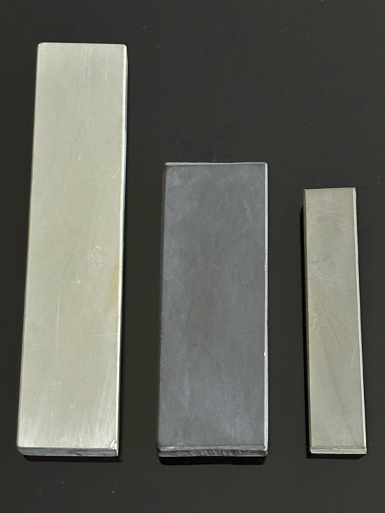 Da auch der Eigentümer ein wenig mehr über das ,,Fischstäbchen" wissen möchte, habe ich nochmals etwas bessere Fotos gemacht und stelle hier erneut die Frage, ob jemand etwas über den Hersteller und/oder die Herkunft des Steines machen kann. Die Maße sind in Bezug auf Länge und Breite konform mit einer Übersichtstabelle über damals angebotene Thüringer Schärf- und Abziehsteine. Was uns allerdings dennoch ein wenig stutzig macht, ist die Stärke bzw. die Dicke des Steines. Dieselbe ist nicht durchgängig von gleichem Maß, sondern verläuft ,,schief", von 15 mm ansteigend auf 20 mm. Die Farbe ordne ich mit Blaugrün/Hellgrün ein. Zum Vergleich habe ich ein Foto erstellt, auf dem neben dem ,,Fischstäbchen" (rechts) auch ein blauer (Mitte) und ein hellgrüner (links) Thüringer zu sehen sind.