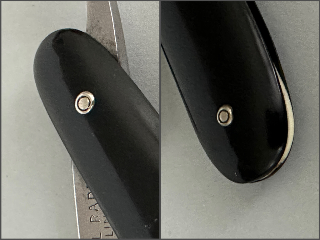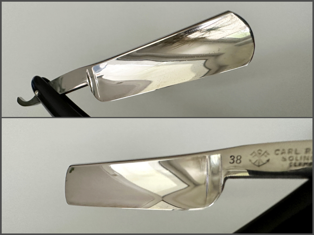 Es handelt sich hier um ein Messer mit klassischem Rundkopf und 6/8 (13/16)* Klinge mit doppeltem Ansatz. Die Klinge ist vollhohl, mit ganz feinem Wall geschliffen und ist hochglanzpoliert. Wenn ich recht recherchiert habe und meine bescheidenen Kenntnisse mich nicht täuschen, handelt es sich wohl um eine Klinge von vor 1957. Da wurde die Fa. Carl Rader von der Fa.DOVO übernommen. An der Klinge konnte ich auch unter Zuhilfenahme der Lupe keinerlei Schäden oder auch nur einen einzigen Rostpickel erkennen. Lediglich im hintersten Bereich ist die Facette minimal breiter ausgeschliffen als über den Rest der Schneidkannte. Ich gehe davon aus. das ein Vorbesitzer das Messer auf den Steinen hatte. Wie angesprochen, konnte ich keine Schäden erkennen, das gilt auch für die Schneidkannte, mit Hilfe eines runden Kunststoffheftes habe ich einmal ,,die Perle laufen lassen" und Risse sind auch dabei nicht zu entdecken, alles i.o.
