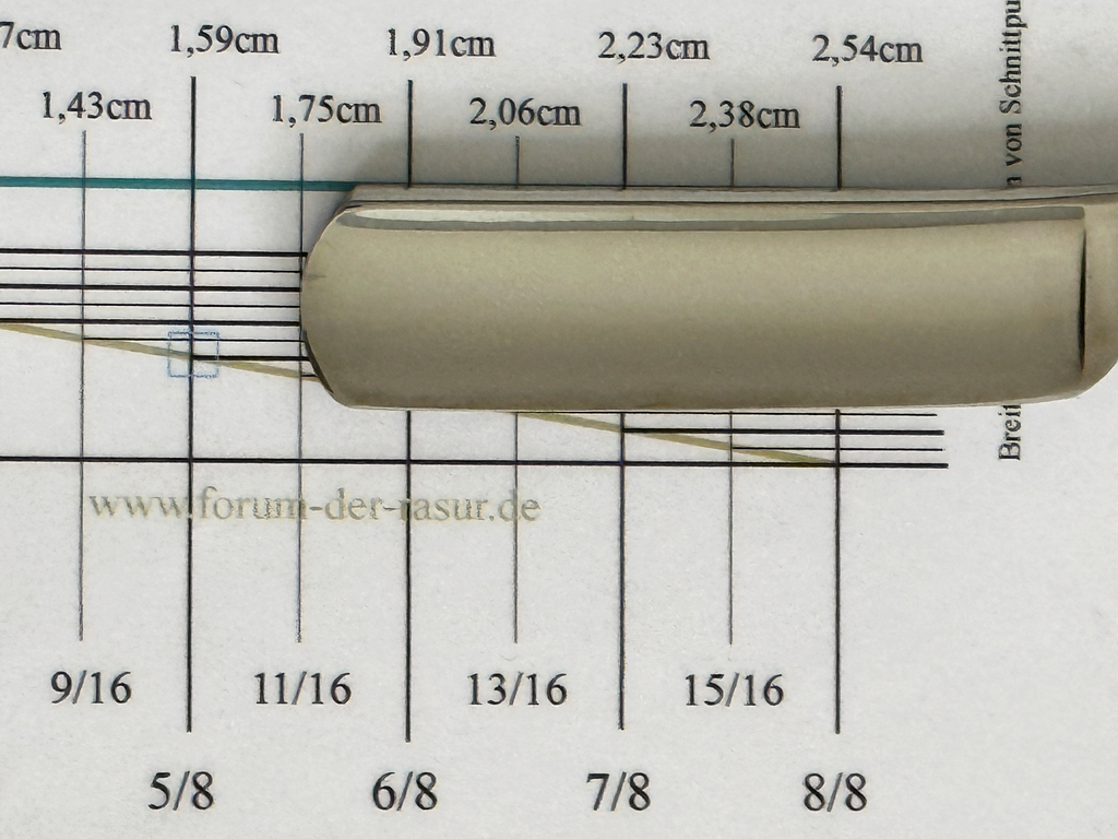 *) Bei der Bestimmung der Klingenbreite habe ich die Abschlußkannte des Rückens auf die Maßlinie gelegt. Daher auch die 13/16, bei auflegen mit Beginn der Hohlung ist es sehr genau 6/8.