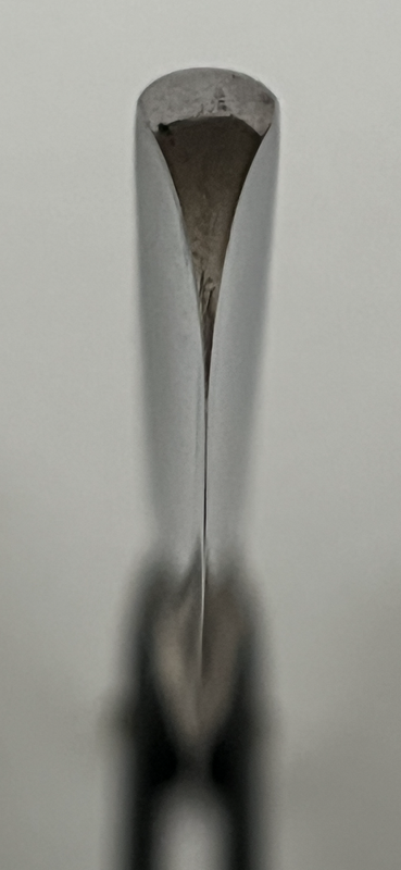 Der Schliff ist nicht allzudünn, es bildet sich nur eine kleine Perle wobei davon auszugehen ist das die ursprüngliche Klingenbreite