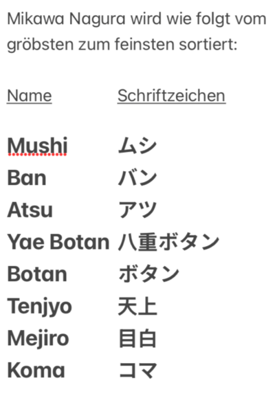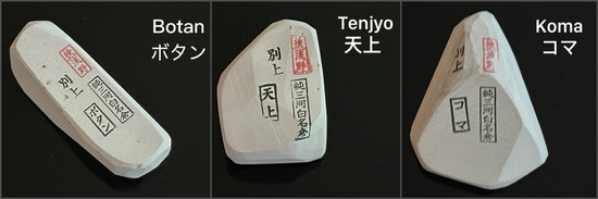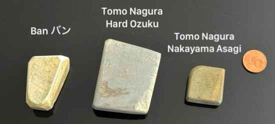 Bis auf den jeweiligen TOMO-Nagura, welcher ja identisch mit dem Basisstein ist, habe ich bei den Progressionen die gleichen drei NAGURA (hier in Reihenfolge von grob zu fein genannt) verwendet: einen BOTAN, TENJYO und einen KOMA.
