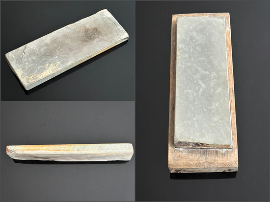 Erworben habe ich diesen wundervollen Stein im Frühjahr vorletzten Jahres und habe ihn seitdem bereits viele Male als reinen Finisher mit und ohne Zuhilfenahme eines Tomo-Nagura erfolgreich genutzt. Der Stein ist sehr fein und laut Beschreibung seines äußerst kundigen Vorbesitzers zwar als relativ hart und als sehr schnell eingestuft, er liegt aber in Sachen Härte definitiv hinter meinem zweiten jNat, einem OZUKU, zurück. Den Stein habe ich bisher ausschließlich mit klarem Wasser verwendet. Sein eigentliches, schnelles und sehr feines Potenzial kommt erst unter fließendem Wasser zum Vorschein. Ob mit einem TOMO-Nagura angerieben oder danach im Solo-Betrieb: Ein sehr feiner, ins Gräuliche gehender Abrieb zeigt die hohe Geschwindigkeit an, mit der dieser Stein arbeiten kann. Als reinen Finisher verwendet, konnte ich bisher sehr feine, typisch leicht mattierte Facetten erreichen, die ein ausgesprochen sanftes und gleichermaßen gründliches Ergebnis brachten. (Anm.: Auf den Bildern sind auf dem Stein im oberen Drittel einige Linien und Flecken zu erkennen. Diese sind nicht ,,toxisch", haben keinerlei Einfluss und sind auch während der Nutzung nicht zu bemerken.)