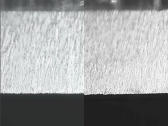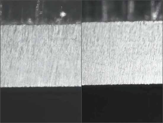 Bei meinem KOMA, und das erfreute mich umso mehr, zeigte sich ein sehr schönes, gleichmäßig feiner werdendes Schliffbild. Der NAKAYAMA liegt im Aufwand/Tempo vorn, der OZUKU liefert aber ein noch feineres Ergebnis ab. Leider kann ich nicht zu 100 % das auf meinen Fotos zeigen, wie es sich mir unter dem Mikroskop darstellt. Selbst mit meiner Ausrüstung kann ich die Dinge nur zweidimensional darstellen. Beide Messer bzw. Facetten zeigen den Übergang zu einer leichten Politur der Schneidkante. Bei beiden Klingen war hier bereits ein HT über die gesamte Länge der Klinge ohne vorheriges Ledern möglich. Den Unterschied in der Feinheit sehe ich mittlerweile im Ursprung mit Sicherheit auch in der Feinheit und Härte der Basissteine. Während der OZUKU hier eher wohl bereits nur polierende Wirkung hat, zeigt das etwas weichere und nicht ganz so feine NAKAYAMA eine feinere Mikroverzahnung an der Klinge.