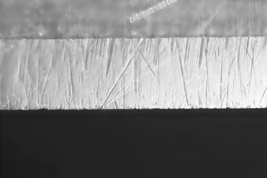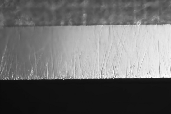 Bei meinem KOMA, und das erfreute mich umso mehr, zeigte sich ein sehr schönes, gleichmäßig feiner werdendes Schliffbild. Der NAKAYAMA liegt im Aufwand/Tempo vorn, der OZUKU liefert aber ein noch feineres Ergebnis ab. Leider kann ich nicht zu 100 % das auf meinen Fotos zeigen, wie es sich mir unter dem Mikroskop darstellt. Selbst mit meiner Ausrüstung kann ich die Dinge nur zweidimensional darstellen. Beide Messer bzw. Facetten zeigen den Übergang zu einer leichten Politur der Schneidkante. Bei beiden Klingen war hier bereits ein HT über die gesamte Länge der Klinge ohne vorheriges Ledern möglich. Den Unterschied in der Feinheit sehe ich mittlerweile im Ursprung mit Sicherheit auch in der Feinheit und Härte der Basissteine. Während der OZUKU hier eher wohl bereits nur polierende Wirkung hat, zeigt das etwas weichere und nicht ganz so feine NAKAYAMA eine feinere Mikroverzahnung an der Klinge.