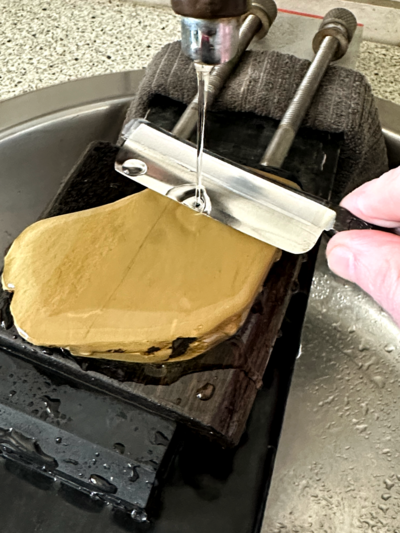 Ein Zwischenledern brachte eine klare Verbesserung und nach weiteren 2–3 Sätzen entschied ich mich dazu, vom stationären Durchgang zu fließendem Wasser zu wechseln. Zwischendurch hatte ich bereits 1 × das Tape gewechselt, habe dies aber jetzt, wo es in Richtung Finish geht, erneut gemacht. Das Schliffbild verbesserte sich unter fließendem Wasser weiter und wurde zunehmend feiner und auch der HT funktionierte jetzt auch ohne erneutes Zwischenledern Zum Finale kam ein 2. Tape auf die Klinge und nach wenigen Wechselschüben signalisierte mir der Stein mit einem schönen ,,Kleben" der Klinge, dass es wohl reicht. Ein letzter Blick durchs Mikroskop zeigte, dass ich die vorderste Kante der Schneidkante wunderbar ,,getroffen" habe ... Es ging zum finalen Ledern, zuerst auf der Seite mit dem Rindleder, anschließend auf die QUERCUR-Cordovan-Seite.