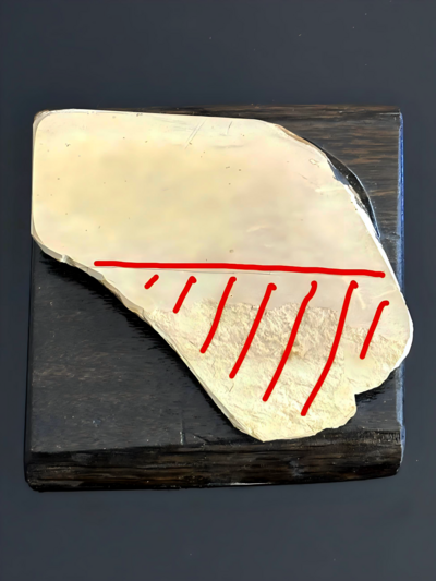 Dieser kleine Japaner befindet sich schon weit über ein Jahr in meinem spärlichen Natursteingarten und fristete bislang zwar nicht unbeachtet, aber unbenutzt sein Dasein. Gestern habe ich mich dann endlich an den wahrlich kleinen Japaner ,,herangewagt" und ihn als reinen Finisher (ohne Nagura & Slurry) in seiner Premiere genutzt. Ich habe mich ja innerhalb der letzten 3–4 Progressionen sukzessiv an ,,kleinere" Steine gewagt, allen voran die Progression auf dem von mir so benannten ,,Fischstäbchen", die wahrlich schon nicht unbedingt einfach war. Dennoch waren alle vorherigen Steine und Progressionen nichts im Vergleich zu dem heute verwendeten jNat, denn alle hatten unabhängig von ihrer Größe ggü. dem kleinen Japaner zwei riesige Vorteile: Sie waren zwar z. T. recht schmal, aber dafür rechtwinklig und vor allem länger. Dieser Japaner hat irgendwie nichts von all diesen Attributen, er ist weder rechtwinklig noch gerade oder lang. Auch täuscht er in der Draufsicht mit einer vermeintlich großen Fläche, denn fast die Hälfte der Fläche ist unbrauchbar (rot schraffierte Fläche im Bild). Nutzbar sind lediglich ca. 5,5 × 3,5cm.  Über Herkunft, Bezeichnung, Härte und genaue Beschaffenheit habe ich leider keinerlei Informationen. Von der sandgelben, ins Ockergelb übergehenden Farbe her vergleiche ich ihn mal mit meinem Nakayama Asagi, was die bei jNats gern genannte Härte angeht ... Keine Ahnung, einzig die Tatsache, dass sich während der ,,Kleinarbeit" keinerlei Autoslurry oder dunkler, metallener Abrieb zeigte, kann ich da ins Rennen werfen. Für alles andere fehlen mir da definitiv auch die notwendigen Fachkenntnisse.