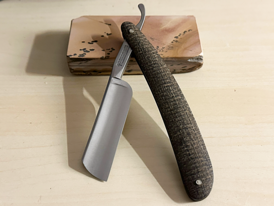 Ich habe ausschließlich freihand auf dem ,,Lütten" geschärft, nur mit klarem Wasser, zuerst mit nur 1 x Tape, dann ging es zum Finale unter fließendem Wasser, zum Schluß mit einem 2.Tape. Geledert wurde mit dem QUERCUR Shell Cordovan und meinem SM-Riemen Nr.IV.