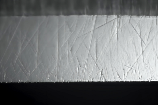 Als erstes Messer kam das GARANTIE SOLINGEN an die Reihe, es war ja mal mein erstes ,,Übungsmesser" mit einer Solinger Klinge. Seit langem aber im wohlverdienten Ruhestand durfte es aber zu Ehren der treuen Dienste als erstes Messer auf den neuen Stein. Da ich in meinen Recherchen zu dem CF auch gelesen habe, dass man ihn anstatt, wie überall beschrieben, mit Öl wohl auch mit Wasser nutzen kann, war also meine Wahl auf klares Wasser aus der Sprühflasche gefallen. Irgendwie wollte ich es wohl auch so weit wie möglich nach hinten schieben ... das mit dem Öl. Nach dem Auffrischen ging es also mit klarem Wasser los. Zuerst mal ein Blick mit dem Mikro auf die Facette, man muss ja was zum Vergleich haben. Die ersten zaghaften Wechselschübe brachten da eine eher befremdliche Geräuschkulisse hervor, irgendwie blechern, weit weg von feinem, geschmeidigen gleiten. Naja, dachte ich mir, ist bei frisch geplanten Steinen halt so ... weiter geht's. Nach gut 2 Sätzen ging ich zu meinem gewohnten ,,16⇅ & 3⇅"-System* über. Vom Stein & Messer kam keine Rückmeldung, selbst nach gut 10 Sätzen Wechselschüben, nix, rein gar nix ... außer diesem ganz besonderen ,,Klang". Ein erster Kontrollblick unter dem Mikro ließ mich erschrecken ... Auch hier nix, nada, nahezu alles unverändert. Die Facette hatte ein paar kleine Kratzer zusätzlich, aber sonst irgendwie keine Änderung zu vorher. Was ist hier los? War das ,,Einbrechen" total misslungen, habe ich einen dieser Steine, die nicht können, wollen oder ... oder...oder ...? Endlich kam ich dann auf die wohl naheliegende Sache überhaupt ... Es ist doch ein Ölstein, zumindest offiziell. Etwas zaghaft schaute ich auf die vor mir aufgereihten Pülleken der verschiedenen Öle, die mir zur Verfügung stehen. Ich entschied mich aber nicht für Öl, sondern erst mal für mein Glycerin/Wasser-Gemisch (50/50). Sieht aus wie Öl, es gleitet wie mit Öl, allerdings kann man es aber abwaschen. Vielleicht ist das ja so ein Schärfer-Gen, das da innerlich immer noch vor Öl auf einem Schärfstein warnt, wer weiß.