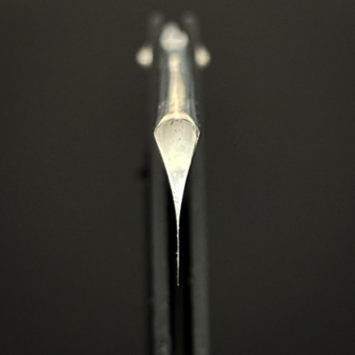 Als Grundform des Heftes habe ich mich auch diesmal wieder für ein klassisches Heft entschieden, dabei aber versucht, durch die etwas ,,gedrungenen" Proportionen die kurz wirkende Klinge zu betonen. Um das klassische, aber (ich finde) elegante Aussehen zu unterstreichen, habe ich mich bei der Wahl der Vernietung auch eher an eine nicht zu dominante Form gehalten und die ,,Standard"-Rosetten/Nieten in Neusilber aus dem Hause KORAAT gewählt. Dennoch, wie immer im Leben, hat auch die Schlichtheit ihre Grenzen und eine Art ,,Eye-Catcher" musste dann doch sein ... Den Abstandshalter (denn keilförmig ist der Keil ja nicht) habe ich auch bei diesem Messer als ,,Sandwich" gefertigt. Das war aber doch schon recht schwierig, schon beim ersten ,,Probeliegen" der Klinge, dabei ermittelte ich die Maße des Abstandshalters, stellte sich heraus, dass diese doch recht schmale Klinge auch einen recht schmalen Abstandshalter benötigt. Letztendlich sind es 2mm geworden und ich musste schon ein wenig in meinem Materialfundus suchen, um entsprechendes für eine Sandwich-Bauweise zu finden. Herausgekommen ist ein Mittelstück aus 1mm starkem Neusilber, eingefasst von weißem, 0,5mm starkem Kunststoffmaterial.