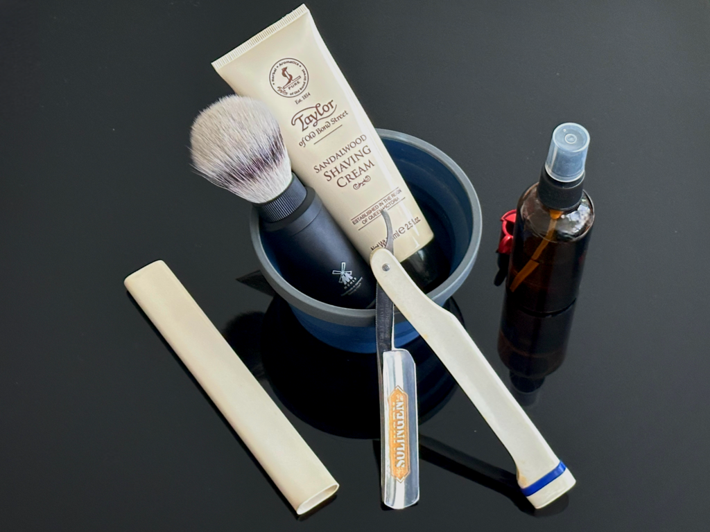 Gereinigt und frisch geschärft (Nakayama Asagi), macht der kleine Begleiter doch einen guten Job, man muss aber natürlich auf die bauartbedingte Feuchtigkeitsansammlung in seiner ,,Reisekutte" achten. Vom Ansatz her, sicher eine tolle und praktikable Transportsicherung, man kann nicht in eine ungewollt offene Klinge im Kulturbeutel greifen, aber bei Vernachlässigung der Reinigungsarbeiten nach der Rasur ist da wohl Rost & Pest vorprogrammiert...