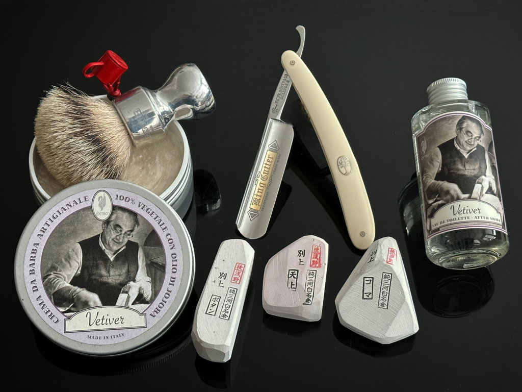 Gestern hatten meine drei neuen NAGURA bei einer ausgiebigen Steinzeit ihre Premiere und heute erfolgt entsprechend erwartungsvoll und neugierig die Rasur mit dem frisch geschärften Böker. Obgleich ja die NAGURA zwar eine Hauptrolle spielten, waren sie dennoch auch ,,nur" ein Teil der umfangreichen Progression. Das Ergebnis stellt mich mehr als zufrieden, ein sehr sanftes und gründliches Rasurverhalten über drei komplette Durchgänge. Auch in meinen ,,Problemzönchen" gab es nicht wirklich was zu meckern, das ,,Zaubern" verlief auch gegen den Strich sanft und gründlich.