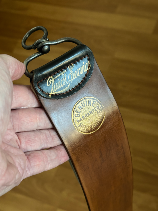 Es handelt sich um einen Abziehriemen ,,MEDALL OF AWARD RAZOR STROP Nr. 813" aus Pferdeleder, ,,GENUINE HORSESIDE WARRANTED",  mit einem zusätzlichen Leinenriemen. Angeboten wurde der Riemen auf einer der üblichen Plattformen und er wurde als ,,guter gebrauchter Zustand" beschrieben und ich kann bestätigen, dass diese Angabe(n) vollkommen zurecht so benannt wurden. Das Leder wies lediglich einen kleinen, nur oberflächlichen Minicut von knapp 1cm auf, ansonsten waren keine Beschädigungen erkennbar. Einzig der Gesamtzustand des Leders war doch recht ,,pflegebedürftig", sehr trocken und leider an den Kanten fast durchgängig hochgewölbt. Der Leinenriemen wies überhaupt keine Beschädigungen auf, lediglich kleinere Flecken sind sichtbar gewesen. Die ledernen ,,Handgriffe" und ,,Beschlagsleder" waren bzw. sind an den Nähten hier und da etwas angestoßen, ansonsten gibt es die üblichen Abnutzungen durch den Gebrauch. Schön ist der Zustand aller goldfarbenen Prägungen, die sich über die Zeit der Nutzung gut erhalten haben. Lediglich die obere Aufhängung/Beschlag ist sehr stark mit Rost befallen.