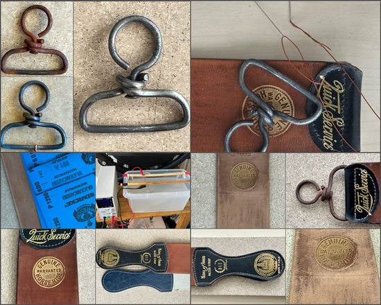Letzteres veranlasste mich auch, das obere ,,Beschlagleder" (?) zu öffnen, um die Aufhängung mit Hilfe der Elektrolyse bestmöglich vom Rost zu befreien. Dazu gibt es hier einen ausführlicheren Bericht. Das Leder habe ich mit Schleifpapier verschiedener Körnungen (400–1200) abgeschliffen, wobei ich nicht alle Flecken entfernen konnte, den Leinenriemen habe ich mit Schwamm und Waschpaste (Rei in der Tube ...) zu Leibe gerückt und konnte so den groben Schmutz entfernen. Alles in allem bin ich mit der Aufarbeitung zufrieden und bis auf das Vernähen stellte alles auch keine große Schwierigkeit dar. Ich hatte erst überlegt, das obere ,,Beschlagleder" durch einen Sattler, Schuhmacher oder dergleichen wieder mit einer Maschine vernähen zu lassen, einerseits war es auch vorher ,,nur" maschinell vernäht, andererseits habe ich nicht derart feines, farblich passendes Material in meiner Lederwerkstatt. Leider gibt es hier im Umkreis keinerlei der o. a. niedergelassenen Berufsstände mehr. Zu einem ,,Mister Minit" wollte ich den Riemen definitiv nicht bringen, also was tun? Na klar, selbst ist der Kerl ... und zwar per Hand, und natürlich mit einer Sattlernaht. Ich mache es im Gegenteil zum Vernähen kurz ... hat geklappt. Ob ich das nochmal mache? Sagen wir es so: Ich werde vorher ausgiebigst darüber nachdenken ...