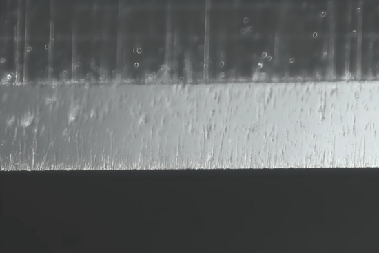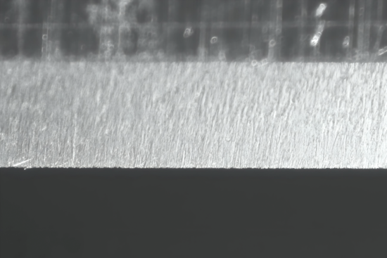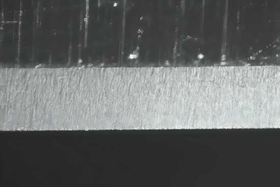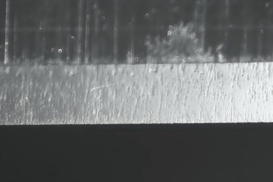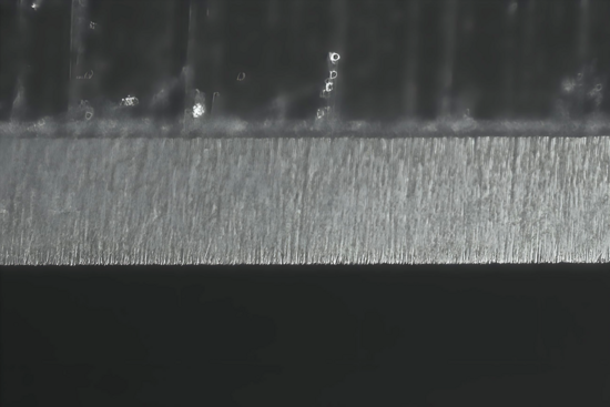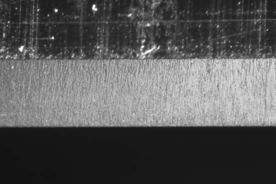 Der KOMA macht im Vergleich der bisherigen Abschnitte (abgesehen von der Schruppscheibe BAN) wohl die schönsten Sprünge. Zuerst recht weniger klar zu erkennen, aber nach den ersten Sätzen doch sehr viel deutlicher. Die Schwierigkeit für mich dabei ist es, das Verändern bildlich so darzustellen, wie es sich meinen Augen mit Hilfe des Mikroskops darstellt. Da sind bereits die Grenzen einzelner Komponenten erreicht, aus denen sich mein Foto-Equipment zusammensetzt. Hier ist als Beispiel nicht zwingend die Beleuchtung oder der (sehr wichtige) richtige Blickwinkel zu benennen, sondern die generelle Tatsache, dass alles ,,nur" zweidimensional dargestellt werden kann. Denn obwohl sich die Schliffbilder zum Teil kaum unterscheiden, sieht das dreidimensional schon sehr viel anders aus. Mit dem KOMA verändern sich die feinen Riefen nicht unbedingt zu deutlich feineren Riefen, aber sie sind deutlich abgeflachter, die feinsten Kanten verrundet. Nicht nur visuell überzeugt der Stein, nein, auch der HT klappt nun bereits ohne weiteres Zwischenledern. Wenn ich mir das Ergebnis des KOMA anschaue, verstehe ich schon, warum gerade dieser NAGURA zu den teureren Steinchen zählt. Wenn die Qualität stimmt, und das tut sie m. E. bei diesem hier, beginnt mit dem KOMA die tatsächliche Fein(s)tarbeit ... ein feines Steinchen!!