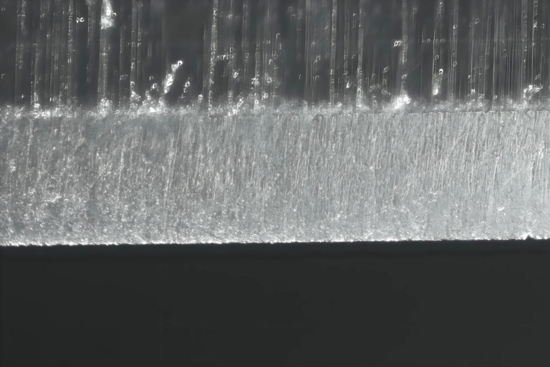 Beim TENJYO habe ich mich entschieden, gleich von Anfang an ,,nur" mit Wechselschüben zu arbeiten. An der Konsistenz und Menge des Slurrys hat sich ebenfalls eine Änderung ergeben: Ich habe nach den ersten 3 Sätzen begonnen, den Slurry mit Wasser Stück für Stück in Richtung ,,klares Wasser" herunterzudünnen. Bei den Kontrollen via Mikro konnte ich zwar auch bei diesem Teilabschnitt der Progression die Veränderungen im Schliffbild erkennen, jedoch waren selbige recht fein. Als sich das Schliffbild m. E. ausreichend fein zeigte, kam voller Neugier neben den optischen Kontrollen erstmals mein Hauptindikator zum Einsatz, der Haartest. Jedoch blieb der erste HT erfolglos und weitere Wechselschübe folgten, bis das Slurry nur noch aus klarem Wasser bestand. Meine ,,normale" Vorgehensweise bei einem erwarteten, aber dann doch nicht erfolgreichen HT ist meist ein kurzes Zwischendern, also, warum nicht auch hier ... Siehe da, wenn auch nur partiell, aber immerhin funktionierte jetzt der HT. Ob aus Ungeduld oder Erwartung, egal, es folgte der Wechsel zu dem NAGURA, auf den ich am meisten gespannt war, dem